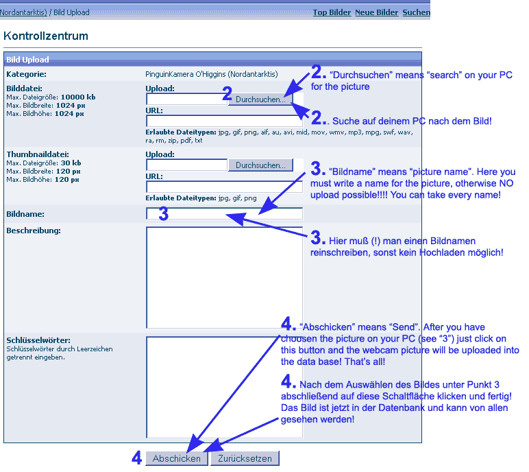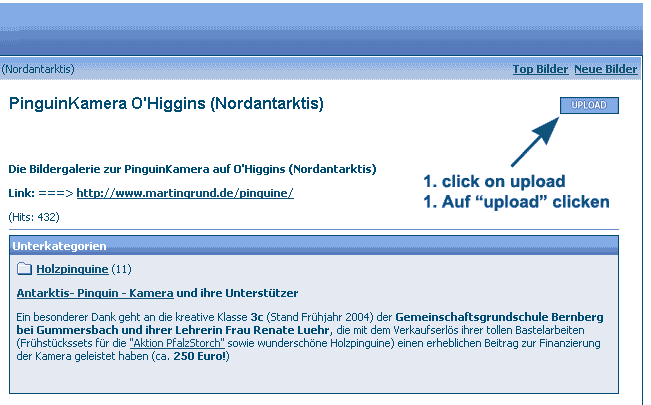 Um ein Bild in die Galerie hochzuladen, zuerst das Webcambild mit dem Browser abspeichern (normalerweise mit der rechten Mausstaste, dann weiter mit "Bild speichern unter" oder ähnlichen Menüpunkten. Da muß jeder selbst schauen, wie es bei seinem Browser funktioniert). Nachdem das Webcambild auf dem eigenen PC gespeichert ist, einfach die untenstehende Anleitung beachten!